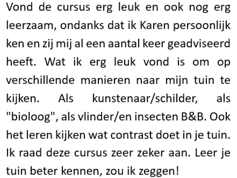 … maar in werkelijkheid kost het je heel veel tijd om het tuinwerk te doen en koop je steeds weer nieuwe planten, omdat niets blijft leven. Je merkt dat je eigenlijk weinig weet over hoe planten groeien en wat ze nodig hebben om te floreren. Laat staan welke planten je kiest voor een natuurlijke, ecologische tuin?